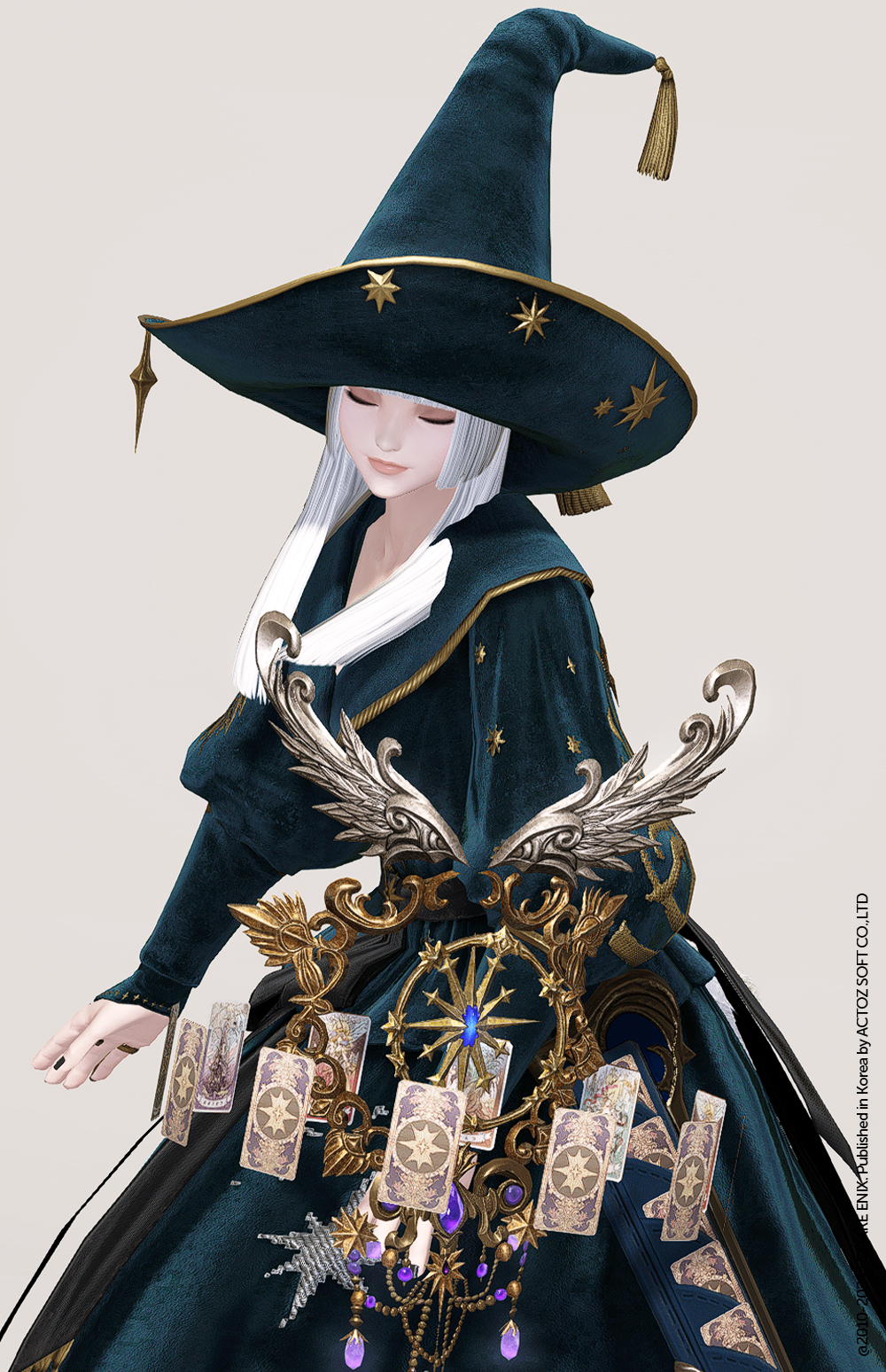 별장식이 인상적인 넓은 챙이 달린, 전반적으로 수수하지만 깔끔한 이미지의 고깔모자입니다. 시야를 방해하지 않도록 부드럽게 휘어진 챙은 테두리까지 깔끔히 마무리되었으며, 단순화 된 별빛 모양의 장식이 한쪽 끝에 매달려 있습니다. 고깔 끝과 뒤쪽에는 보석을 가미한 술장식을 달아두어 전체적으로 밤하늘과 같이 고요하지만 길잡이가 되어주는 별의 느낌을 살렸습니다. 특유의 소재 묘사와 형태가 있어 그에 맞는 이미지로 매치하시면 좋을 것 같습니다.