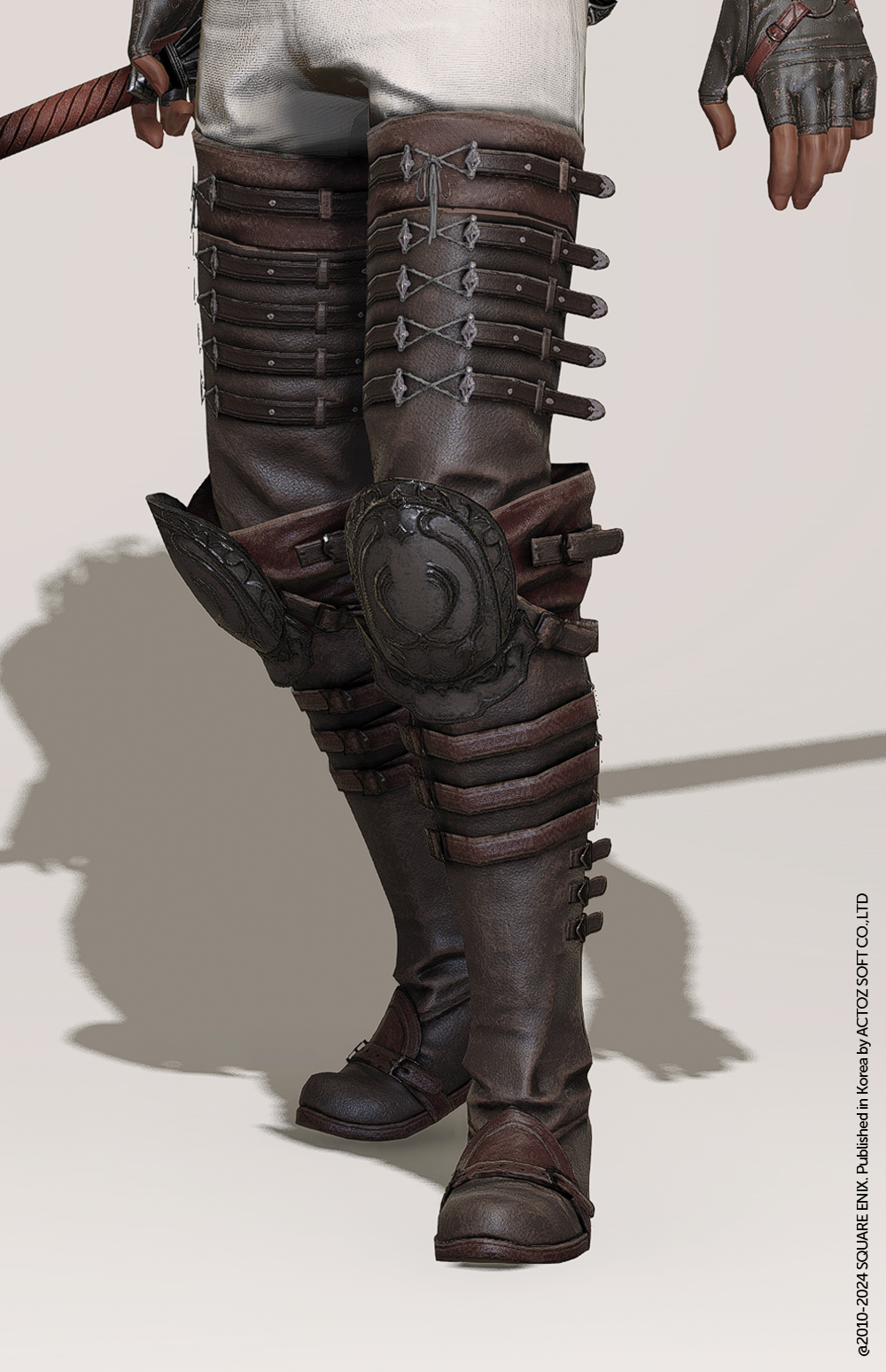 투랄 대륙을 누비는 사냥꾼, 바이퍼의 신발입니다. 얇고 부드러운 가죽으로 통이 널널하게 만들어진 장화 위로, 단단한 가죽들을 각자의 쓰임새에 맞게 고정하여 보호구의 목적을 찾아가는 모습입니다. 특히나 두 마리의 독사가 연상되는 문양을 돋을새김한 철갑을 사용해 무릎을 확실하게 보호하는 점이 좋습니다. 디테일 묘사가 상당한 감이 있어, 이러한 점을 염두하여 패션 조합을 찾는 것을 추천드립니다.