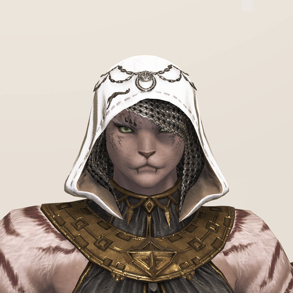 미학 석판 시리즈, 수호자직군이 착용가능한 두건입니다. 서클릿을 연상시키는 우아한 머리장식과 내부에 체인 메일 코이프(chain mail coif)를 덧대 안정성을 높였습니다. 염색이 선명하게 되어 깔끔한 느낌의 천 상의 혹은 갑주 상의와 매치하는 것도 좋겠습니다. 이번 황금 확장팩은 다채로운 후드가 많아서 분위기에 맞게 후드를 선택할 수 있는 부분이 좋네요!