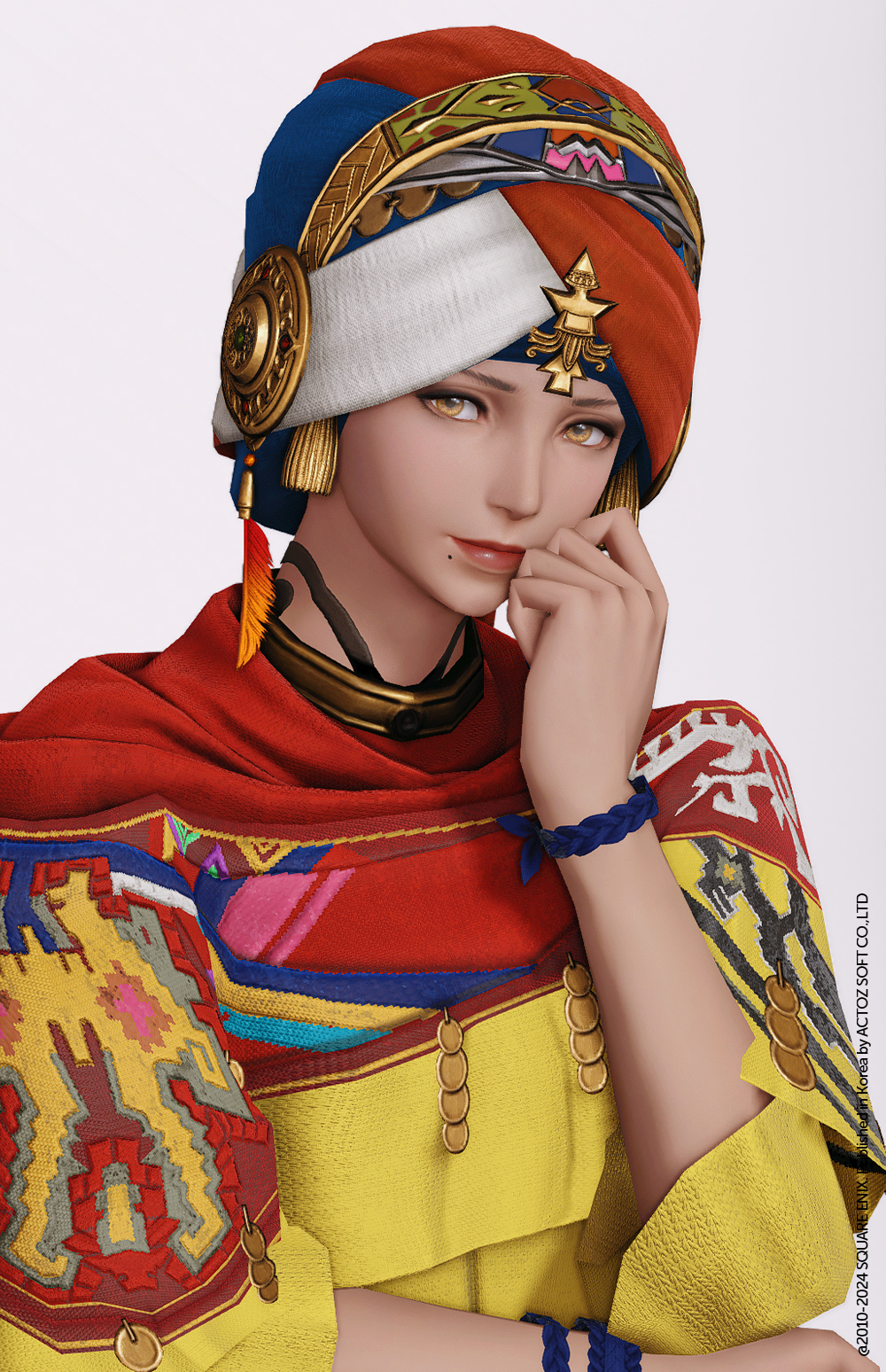 깊이감 있는 색들의 천을 여럿 사용해 머리를 꼼꼼히 감싸고, 고정 겸 세공된 금속 머리띠를 더해 타 지역들과는 다른 고유의 아름다움을 한껏 끌어낸 터번입니다. 머리카락이 거의 드러나지 않아, 얼굴에 이목을 집중시키며 좀 더 신비로운 이미지를 연출하는데 한 몫 합니다. 깃털과 술, 그리고 작은 원판 장식들에 들어간 잔잔한 아름다움이 느껴지는 세공 묘사 디테일이 좋습니다. 뜯어보면 볼 수록 독보적인 아름다움이 있어, 다른 아이템들을 어울리게 매치하는 재미가 있어 보입니다.