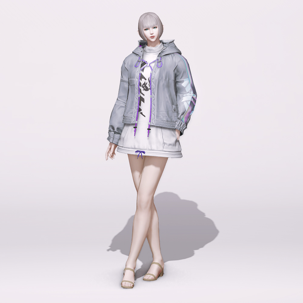 심플하되 큼직한 프린팅이 박힌 티셔츠를 받쳐입은, 뻣뻣하면서도 두께감 있는 재질로 만든 듯한 후드점퍼를 매치한 상의입니다. 테크웨어 패션보다는 서브컬쳐계 패션에 좀 더 가까운 듯한 디자인으로, 사이버틱한 느낌을 주는 장식과 레터링이 포인트. 특유의 홀로그램 재질도 팔쪽에 라인으로 배치하여 그러한 느낌을 더욱 살립니다. 물론, 리본을 묶은 밑단 조임끈 등 귀여움을 살리는 소소한 디테일도 잊으면 아쉽지요. 골반 밑까지 넉넉히 덮어주는 길이감이 특징적이니 허리부분의 디테일이 애매한 하의도 부담없이 곁들여 보는 건 어떨까요? (메이드 머리띠 등의 헤드드레스형 장식도 꽤 어울릴 것 같습니다.) <-사실 이건.. 서브컬쳐계 중에서 천사계로 통칭되는 어떤 코드의 정석조합이긴함 애매하면 빼주세용