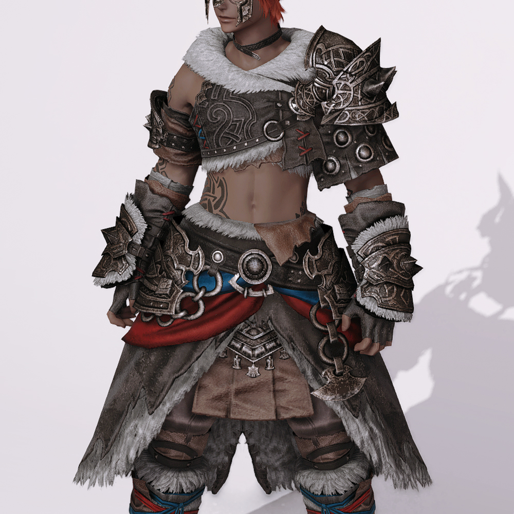 야성미 넘치는 모습으로 고유의 아름다움을 잔뜩 내보이는 의상입니다. 털이 달린 가죽을 사용해 만든 조끼는 든든하게 상체를 덮어주는 동시에, 과감하게 어깨와 복부에 새겨진 문양들을 드러내어 의상이 덮지 않은 부분까지도 패션의 일부로 삼았습니다. 상대적으로 허점을 드러낼 수 있는 쪽으로 견갑 등을 활용해 좀 더 방어를 견고히 한 것까지 전사다운 모습. 전완과 하체 위쪽 역시 가죽으로 든든히 감싸 전사다운 풍채를 만들어줍니다. 하의의 윗부분을 가리는 형식이나 허벅지 앞으로 작은 트임이 있으므로 이를 활용하여 조합해보시는 방법도 좋을 것 같습니다.