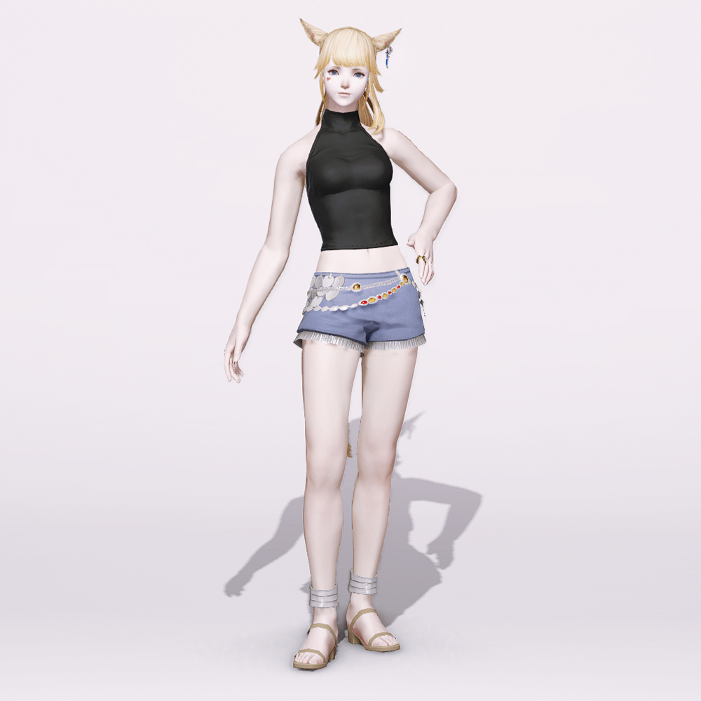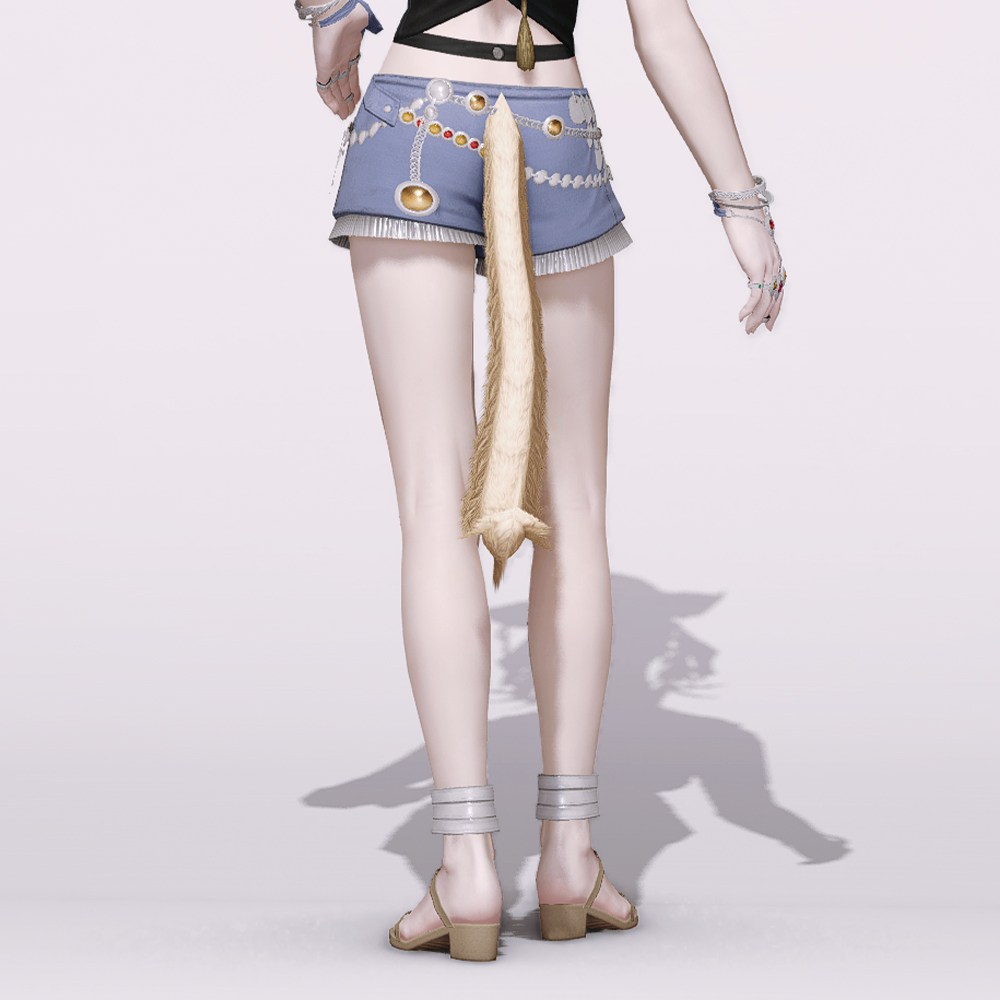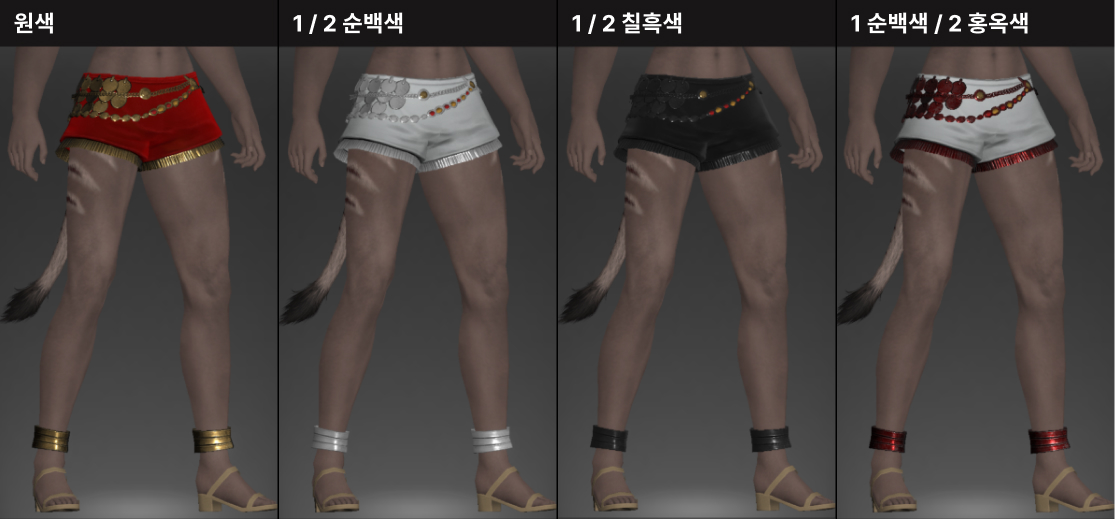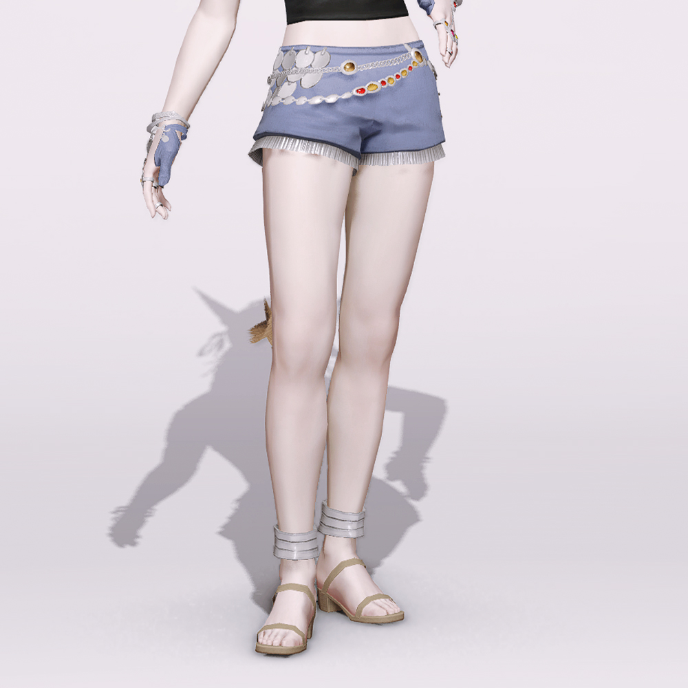 허리는 딱 붙으면서, 통은 넓게 잡아 움직임을 방해하지 않는 숏팬츠입니다. 바짓단 밑으로는 반짝이는 태슬장식을 덧대었습니다. 허리에 감은 장식들은 금속판과 금속구슬을 같은 위치에 놓아 경쾌한 소리를 착용자의 발걸음마다 울려주는 듯 합니다. 발목에도 두께감 있는 심플한 장식을 두어 마무리까지 깔끔히 챙긴 디테일도 잊으면 섭섭할 듯 합니다.