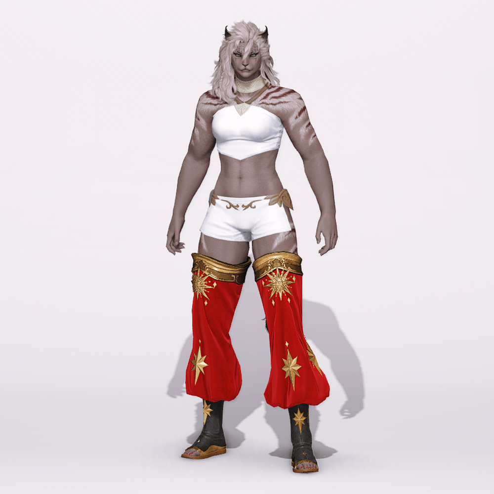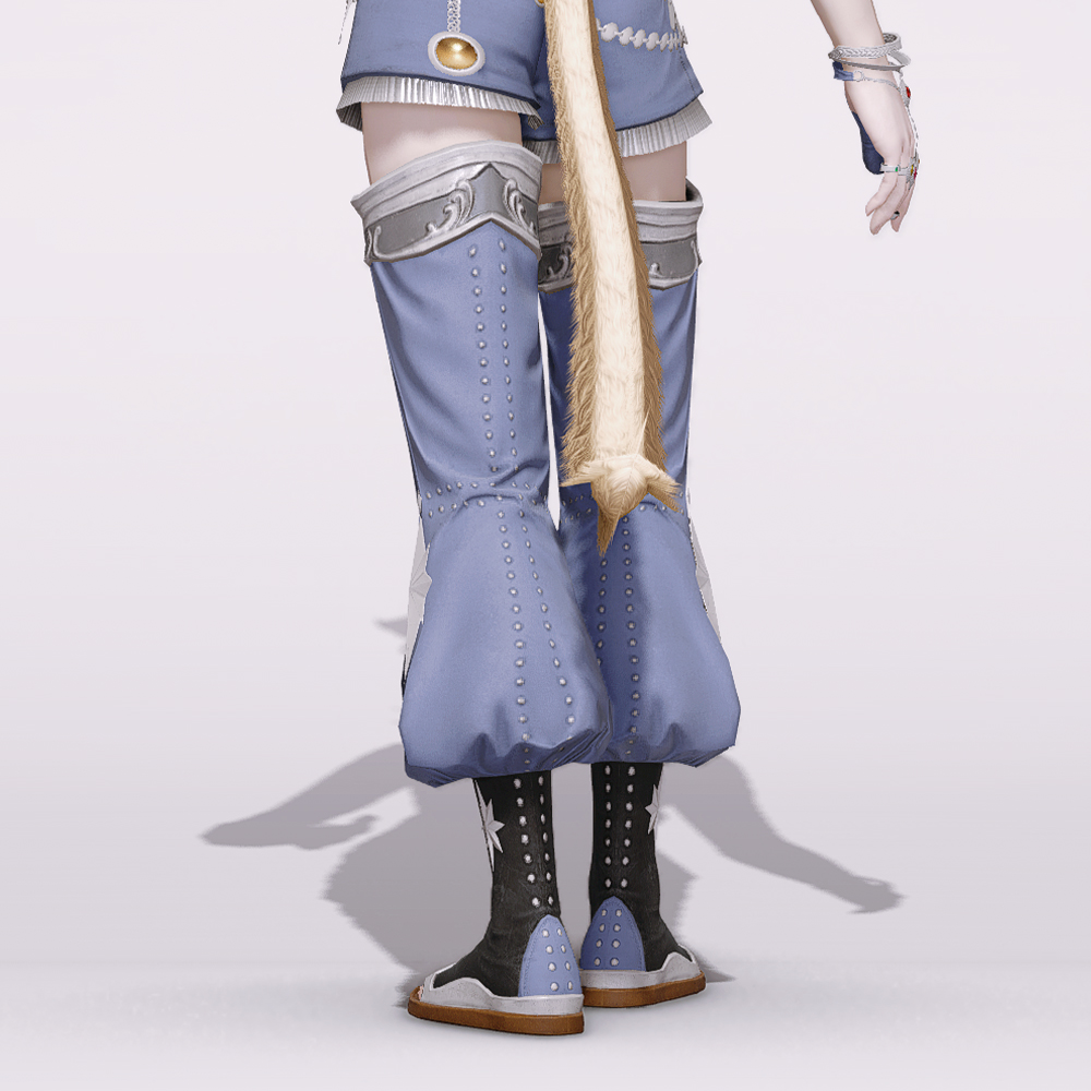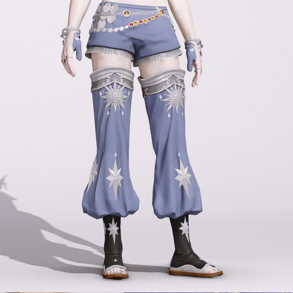 발 끝을 드러낸 얇고 가벼운 장화 위로, 화려한 별장식을 가미한 천을 둘렀습니다. 발걸음을 딛을 때 마다 별이 반짝이는 듯한 느낌을 추구한 걸까요? 전체적으로 큼직하고 심플한 요소들 위로 세공된 디테일이 살아있는 장식을 균형감 있게 배치하여 전반적인 밸런스를 잡았습니다.