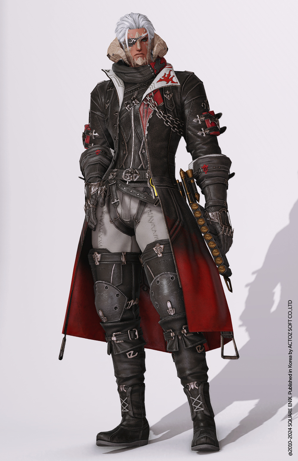 등에는 금속으로 세공된 날개 형태의 장식을 고정시키고, 그 밑으로 사슬과 벨트를 사용해 건블레이드를 사용하는데 필요한 소일 등을 고정 및 수납하여 실용성과 함께 기계장치들이 줄 법한 전문적인 느낌도 살려냅니다. 뭐니뭐니해도, 목 부근에 무심히 두른 스카프가 화룡점정. 황야보다는 좀 더 어둡고 무거운 느낌을 살리는데는 역시 이 외투라고 할 수 있습니다.