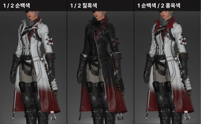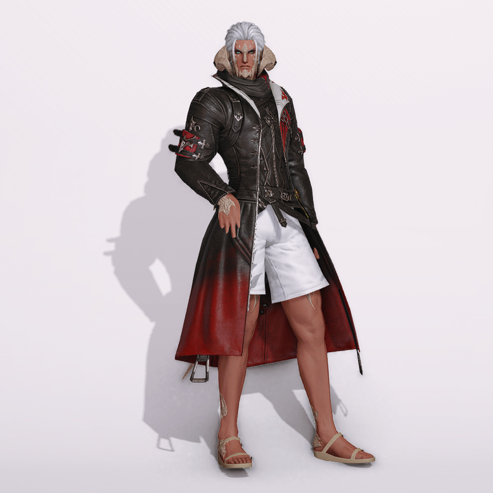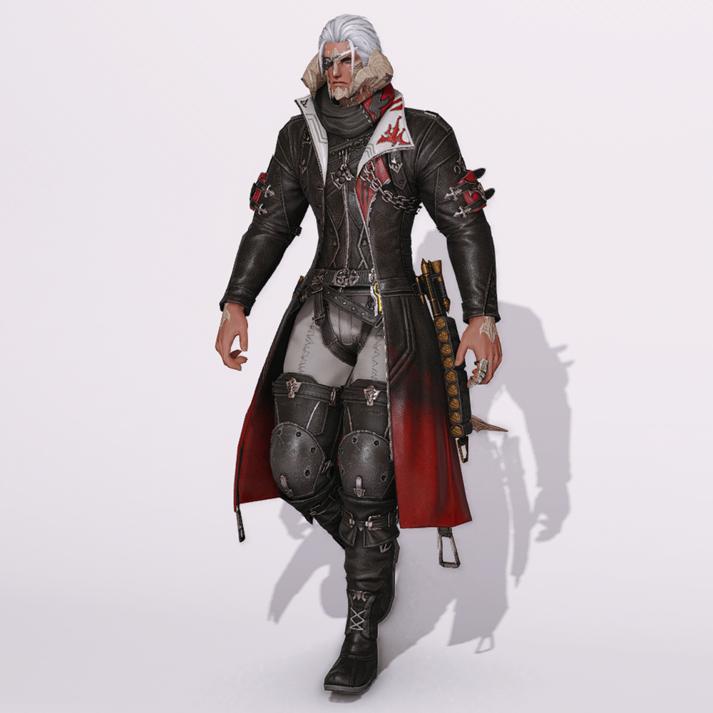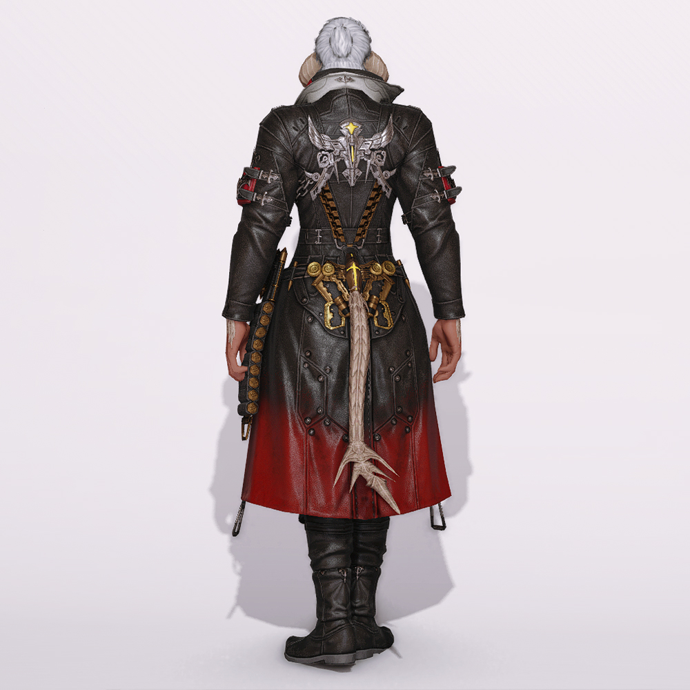 건브레이커 외투중에 가장 타이트한 실루엣으로 딱떨어지는 외투를 찾으신다면 적격입니다. 전장에 부는 건조한, 때로는 피비린내 받치는 바람에 휘날리는 옷자락에 대한 로망을 아신다면 이 외투에 시선이 끌릴 수 밖에 없을 것 같습니다. 부드럽고 탄탄한 가죽으로 만든 상의 위로, 역시 같은 재질을 사용한 외투를 매치하였습니다. 옷깃에는 다른 색의 가죽들을 사용해 포인트를 주었으며, 그 밑으로도 사슬과 벨트를 사용해 거칠지만 다듬어진 어떠한 이미지를 줍니다.