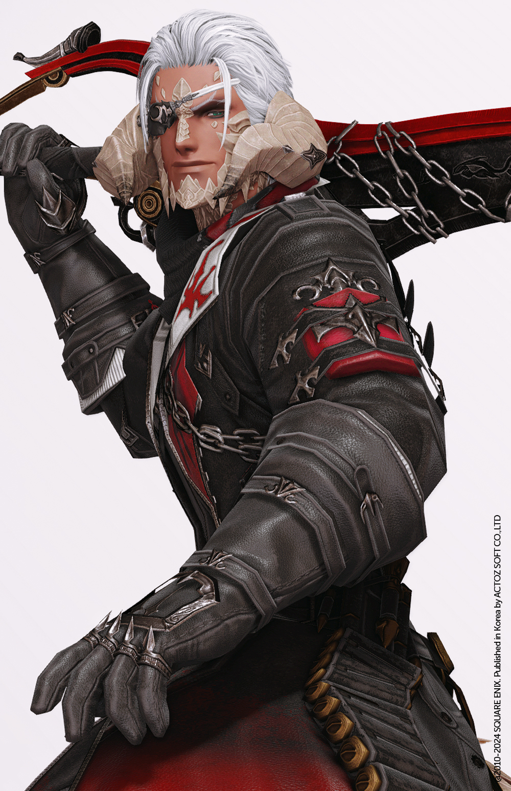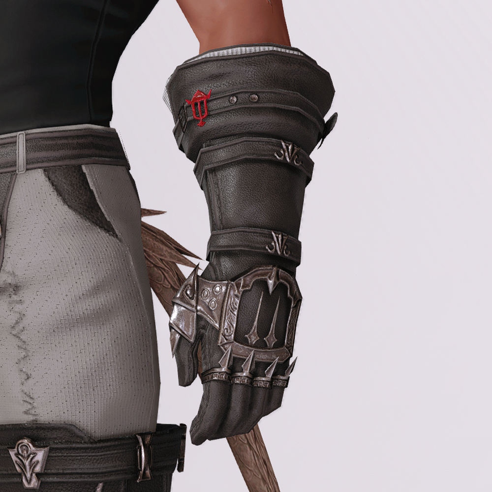 금속 건틀렛보다는 가볍지만 그 못지않게 팔꿈치 밑까지 든든하게 덮어주는 가죽제 장갑입니다. 손목과 팔 부분을 단단히 벨트로 조여맬 수 있도록 하였으며, 고급스러운 문양의 장식을 가미해 미적인 부분도 챙겼습니다. 생각보다 부상을 입기 쉬우면서도 영향이 큰 손등과 손가락에도 금속을 덧대어 방어를 보강할 겸 심미적인 요소도 더한 것이 매력포인트. 가까이서 파고들수록 드러나는 세세한 디테일을 추구하신다면 한 번쯤 추천해드립니다.