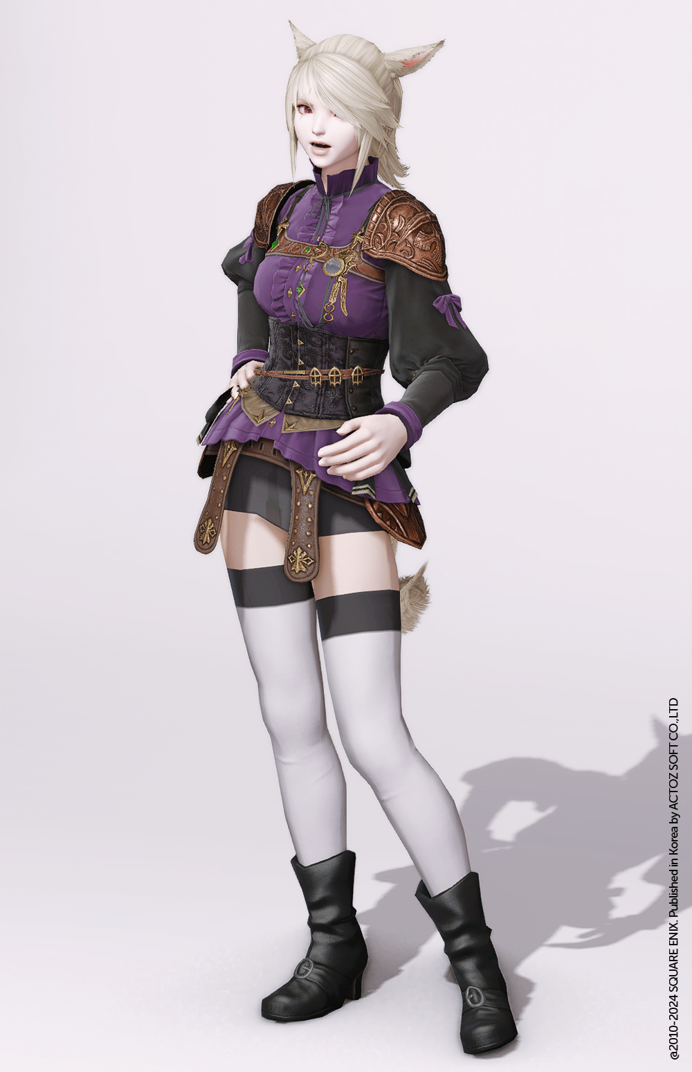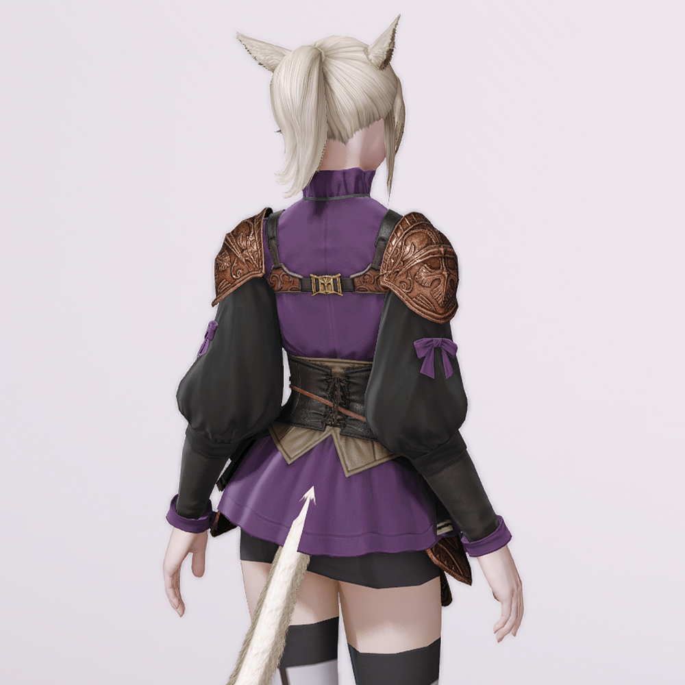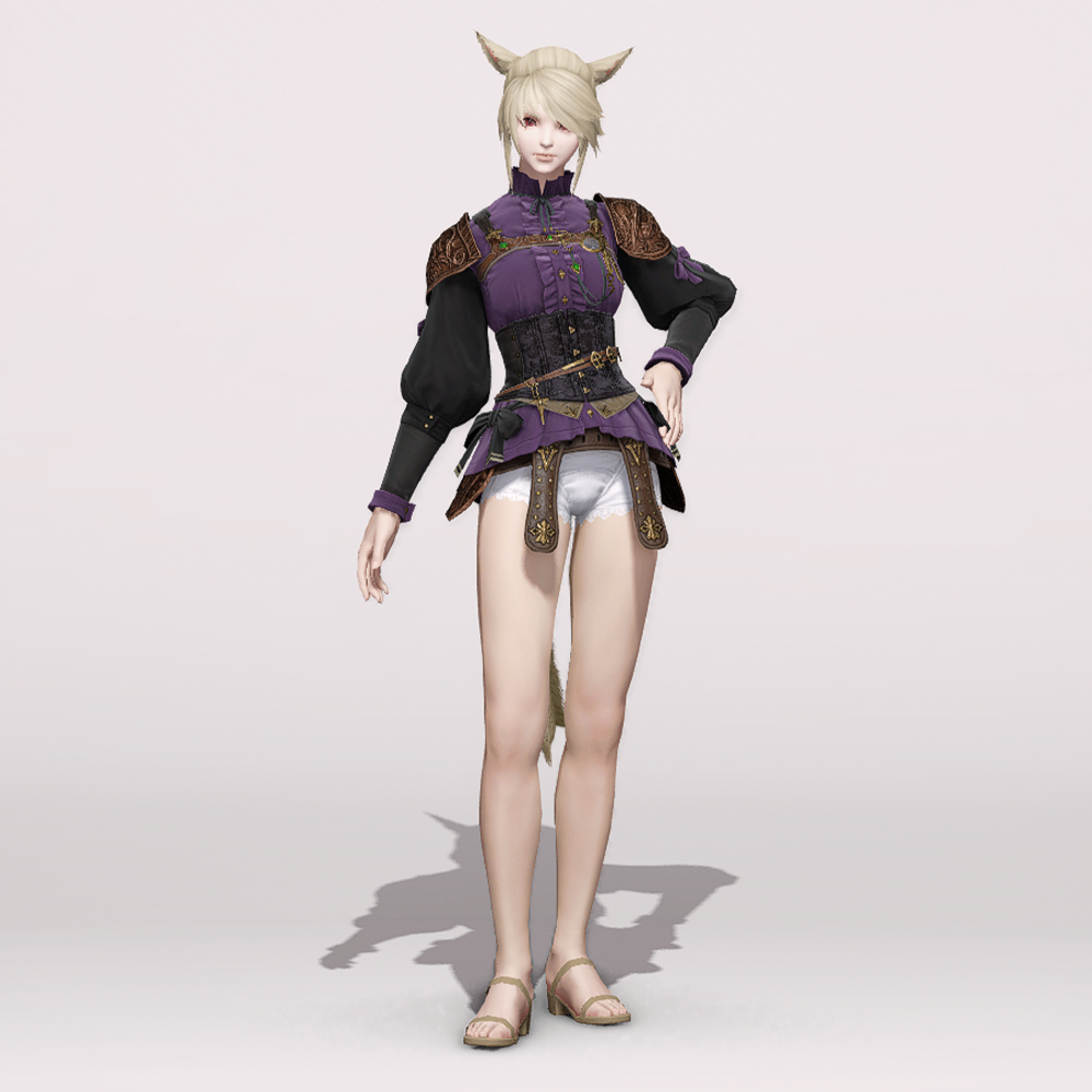 예쁘지 않으면 싸울 힘이 나지 않는 모험가에게 필수 의상이 될 프릴 예복 상의입니다. 전투시에 가벼운 몸놀림을 위한 하네스와 레이스 코르셋등 어떻게하면 더 사랑스러운 조합으로 만들 수 있는지 고민한 흔적이 묻어나는 디테일이 상당합니다. 짧은 하의와 곁들여 가벼운 느낌을, 혹은 긴 치마 등과 조합해 드레스로 연출하는 것도 좋겠습니다. 신이슈가르드나 신이슈가르드의 아더칼라인 카에안/오피오타우르스 장비들과 조합하는 것을 추천드립니다. 염색이 안되는 것이 유일한 단점이지만 어차피 염색버전 주실거라면 빠르게 주셨으면 하는 소망이 있습니다.