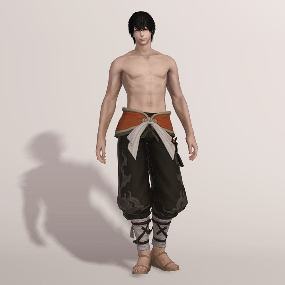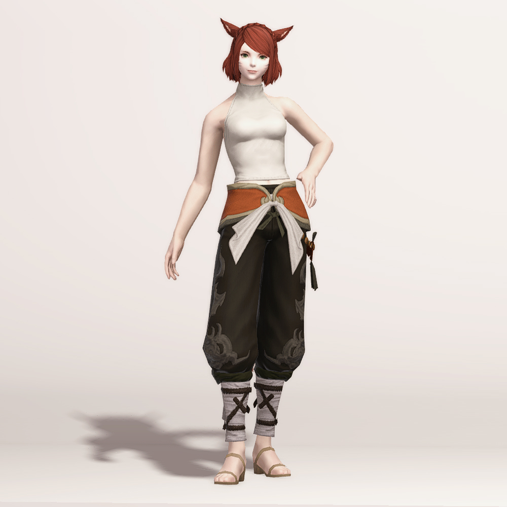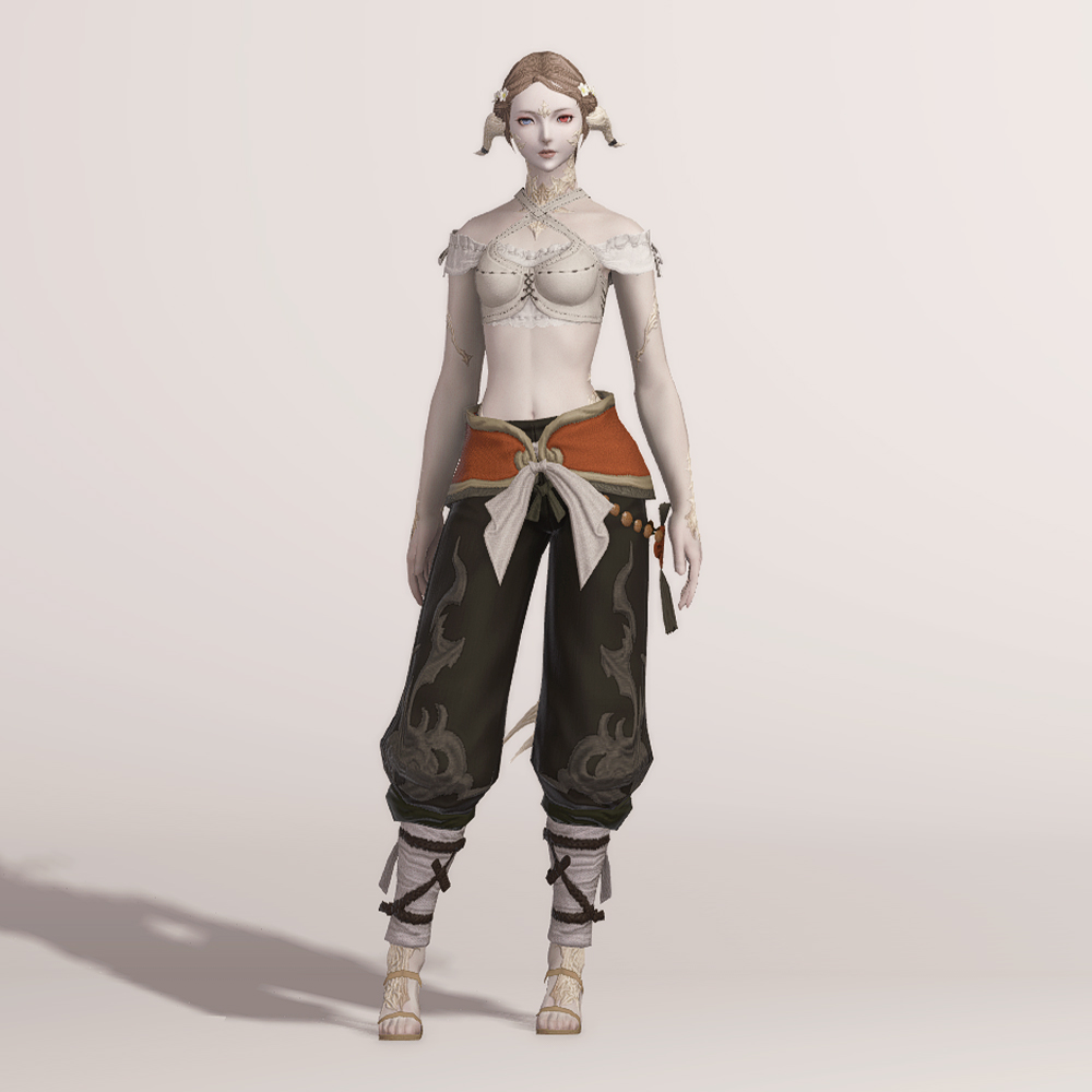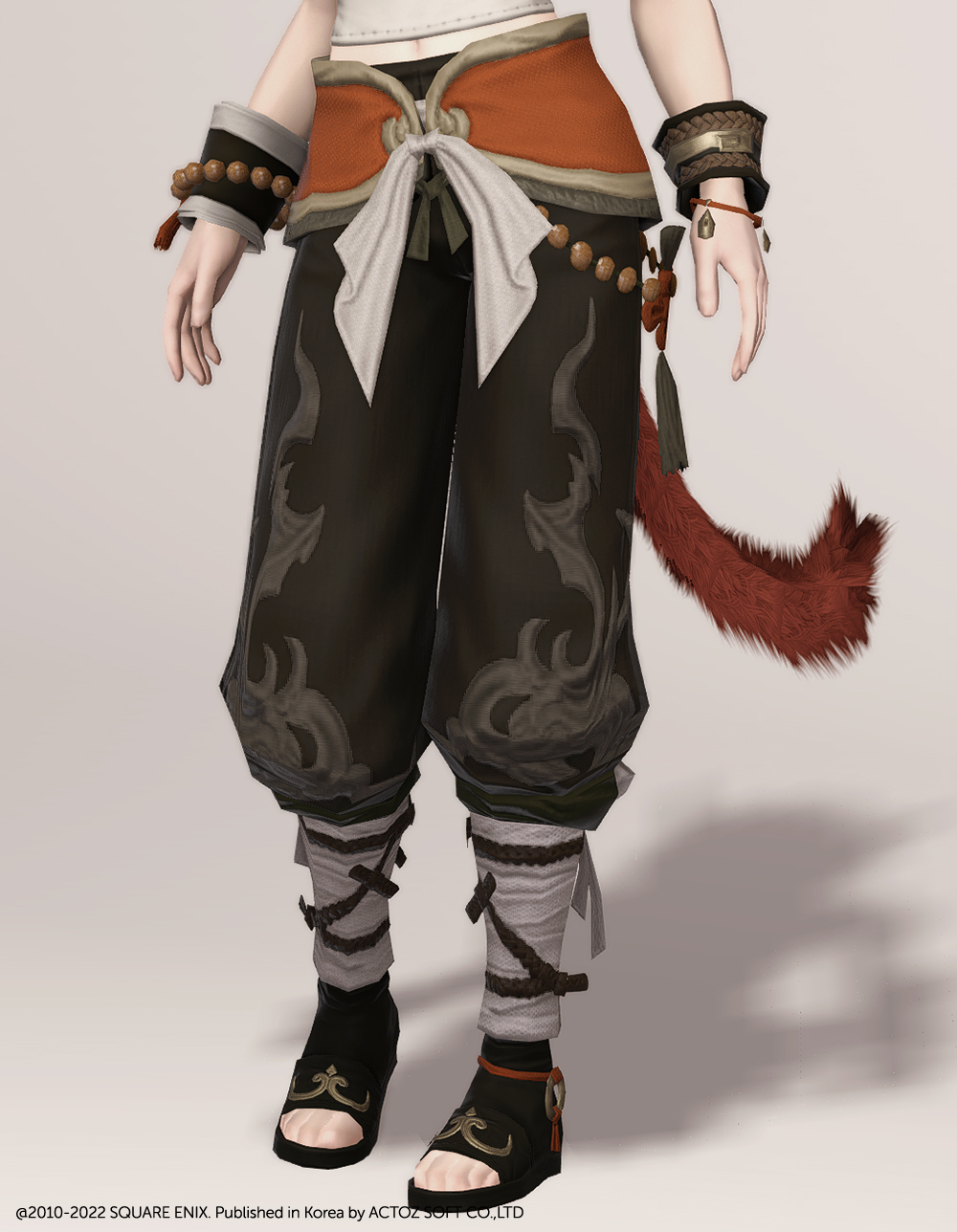 구름이나 연기를 나타낸듯한 무늬가 인상적인 동양풍 7부바지입니다. 허리에 리본으로 묶은 듯한 와이드 벨트 디테일이 있습니다. 발목의 붕대 장식이 수련하기 위한 도복이라는 느낌이 물씬들며 운동화등과 함께 착용하기 좋아보입니다. 같은 동양풍이나 깔끔한 상의 등을 조합해 스포티하게 연출할 수 있겠습니다.