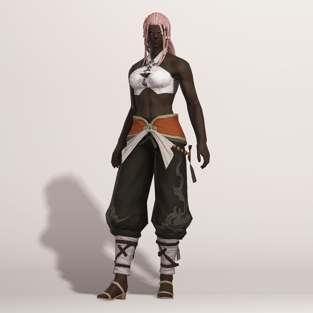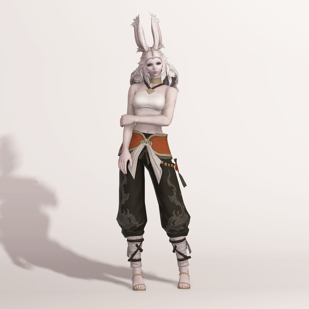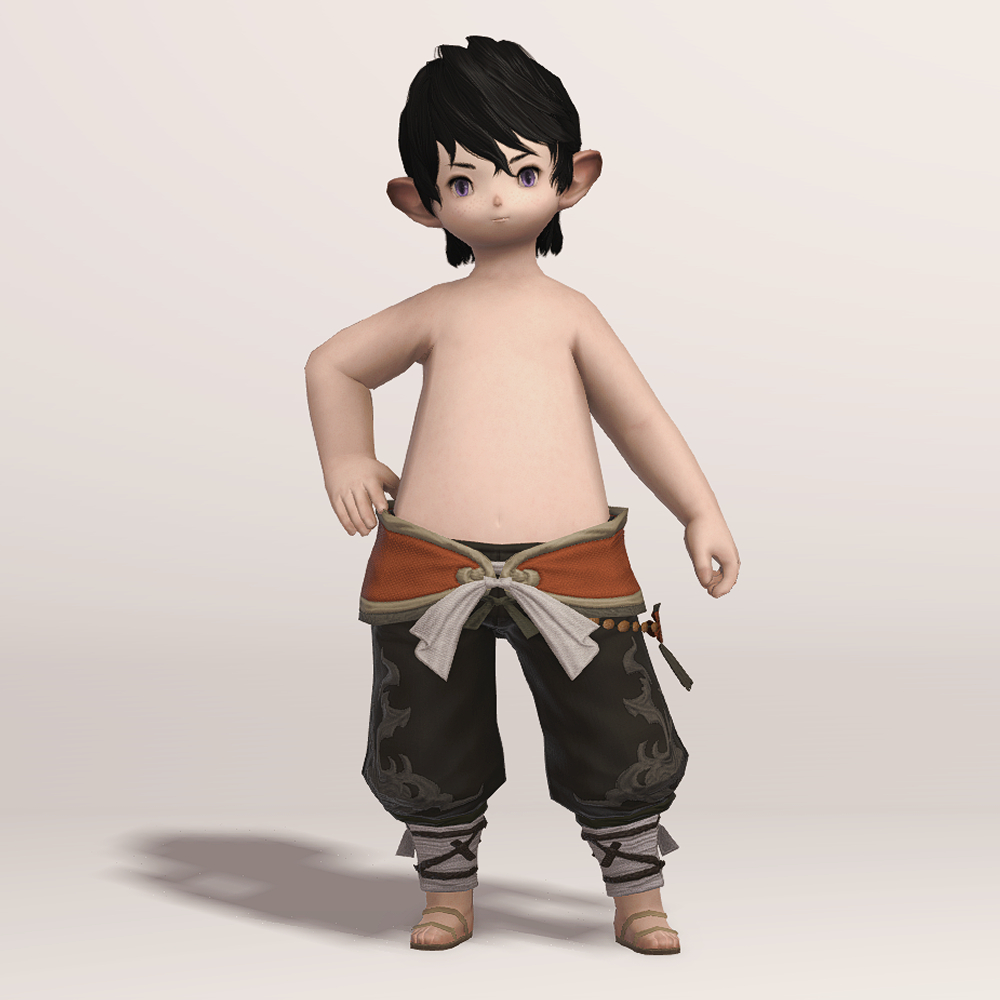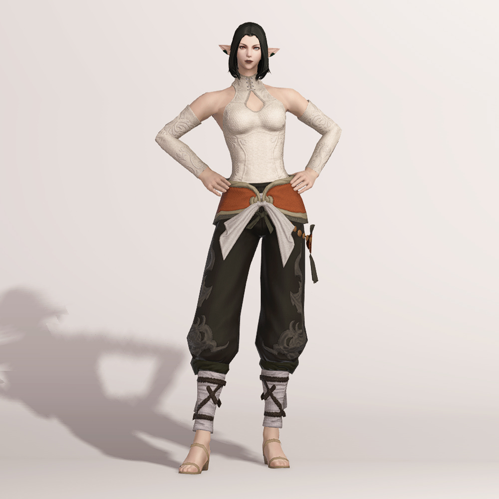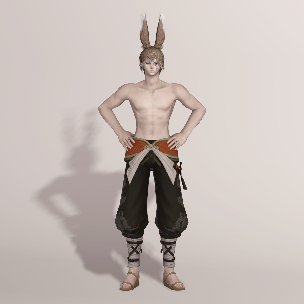 구름이나 연기를 나타낸듯한 무늬가 인상적인 동양풍 7부바지입니다. 허리에 리본으로 묶은 듯한 와이드 벨트 디테일이 있습니다. 발목의 붕대 장식이 수련하기 위한 도복이라는 느낌이 물씬들며 운동화등과 함께 착용하기 좋아보입니다. 같은 동양풍이나 깔끔한 상의 등을 조합해 스포티하게 연출할 수 있겠습니다.