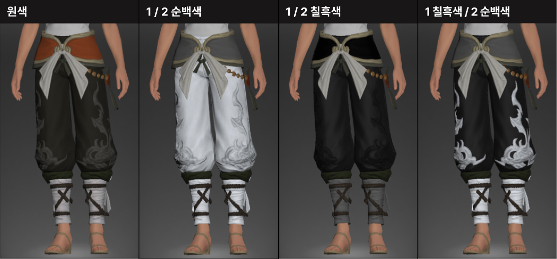 바지의 무늬와 복대의 주황색 부분 및 붕대가 같이 염색됩니다. 바지의 무늬는 선명하게 발색되나 주황색 부분은 짙게 염색되며 반대로 붕대는 옅게 염색됩니다.