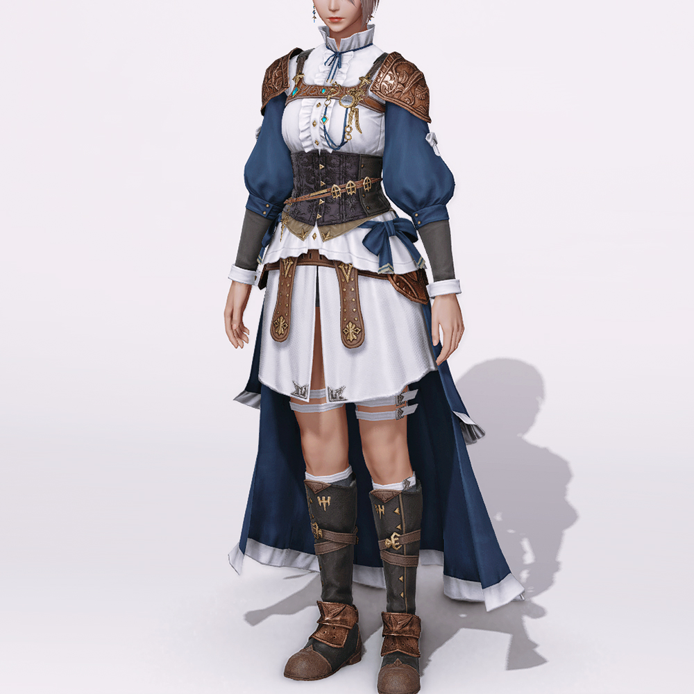 깔끔한 배색과 과하지 않은 프릴, 그리고 아기자기한 디테일이 매력적인 외투입니다. 염색되지 않는 의상이라는 유일한 단점을 제외하고선 적당히 예쁘면서도 깔끔하고, 허리를 타이트하게 잡아주는 코르셋 실루엣까지 군더더기 없는 디자인으로 많은 이에게 사랑받을 수 밖에 없는 디자인입니다. 하의로 깔끔한 바지 혹은 적당한 길이의 치마와 곁들여 가벼운 전투복부터 본격적인 예복까지 커버가 가능합니다.