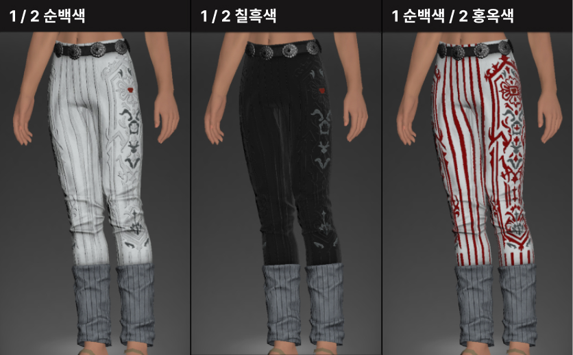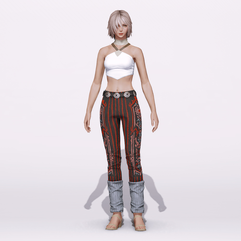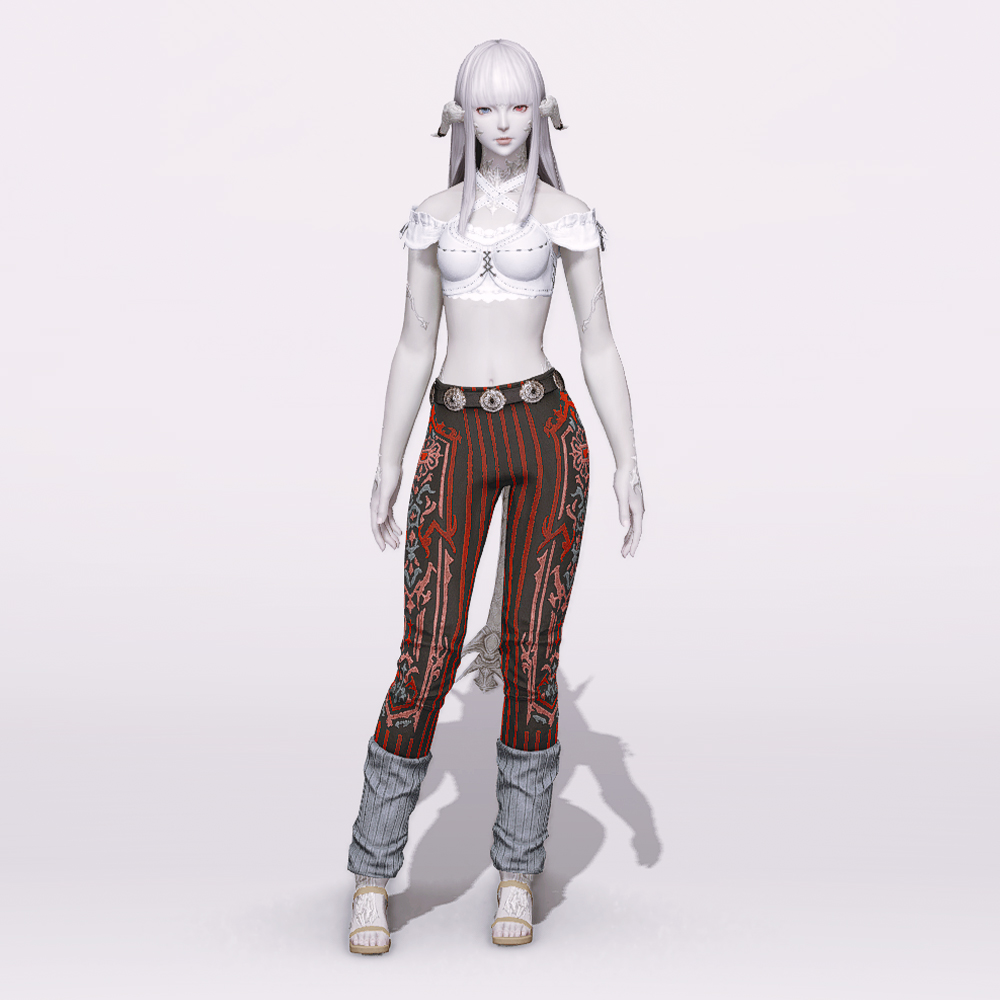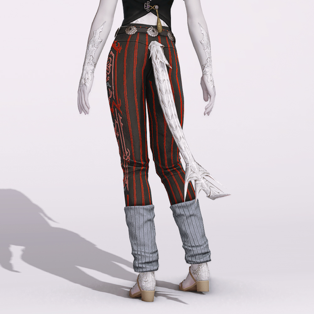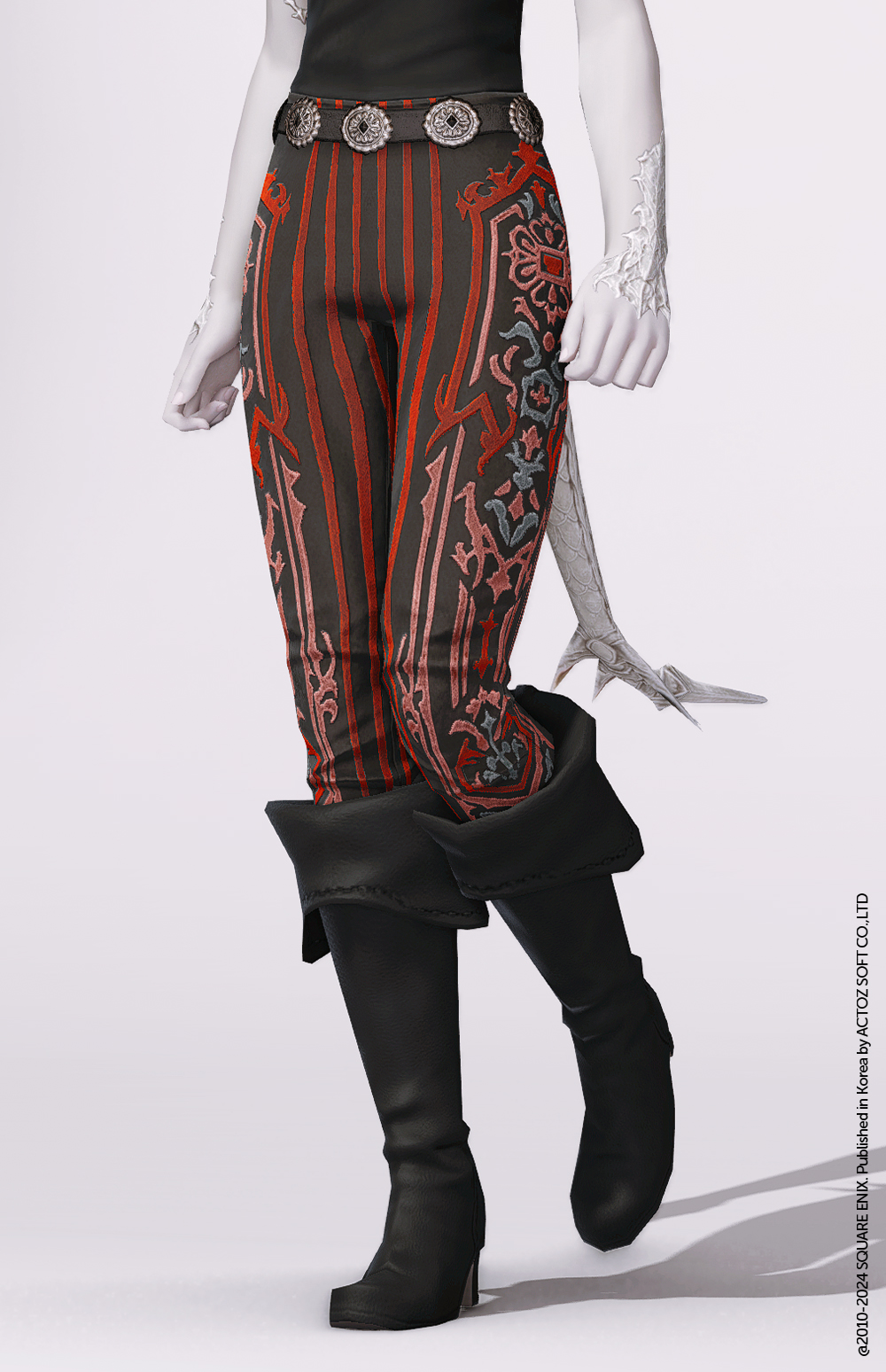 전체에 들어간 줄무늬가 강렬한 인상을 주는 바지입니다. 물론 단순한 줄무늬로 전체를 채우지 않고 허벅지 양 옆으로는 고급스러운 문양을 새겨 개성이 넘칩니다. 금속 장식들을 같이 매치한 허리띠와 무릎 밑 레그워머 형태로 한번 더 감싼 보호대가 위아래로 한 번 정리해주는 역할을 하여 다른 부위에 아이템을 매치하기 쉽게끔 해줍니다. 강렬한 만큼 어떻게 사용하느냐가 관건인 바지입니다.