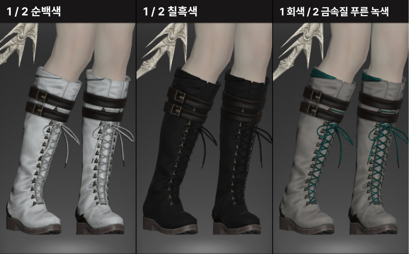 염색1 - 전체적인 장화 가죽 / 염색2 - 장화 뒤쪽 장식과 스트랩