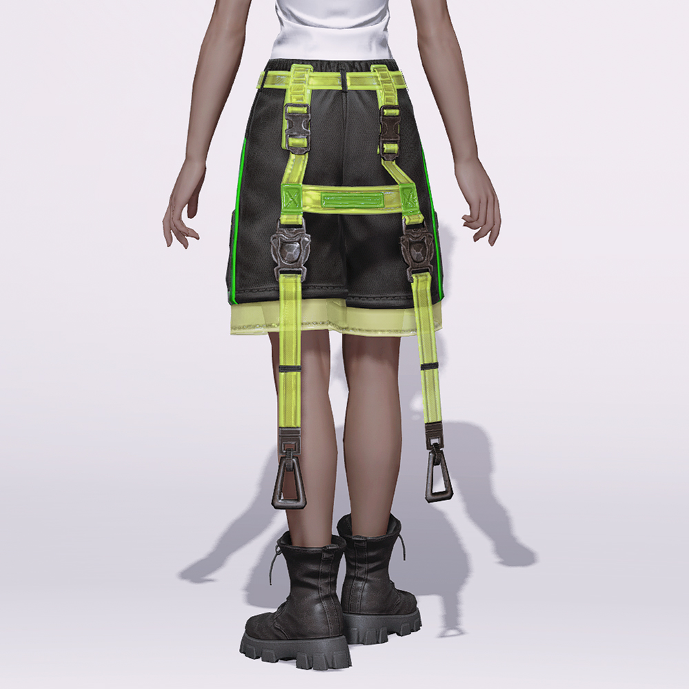 1염색 - 전체적인 바지 천 /2염색 - 형광색 반투명 스트랩 부분