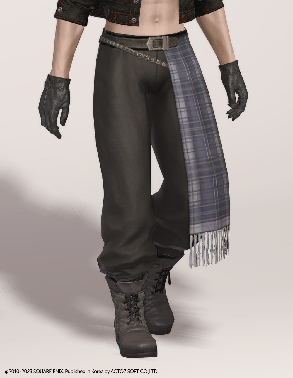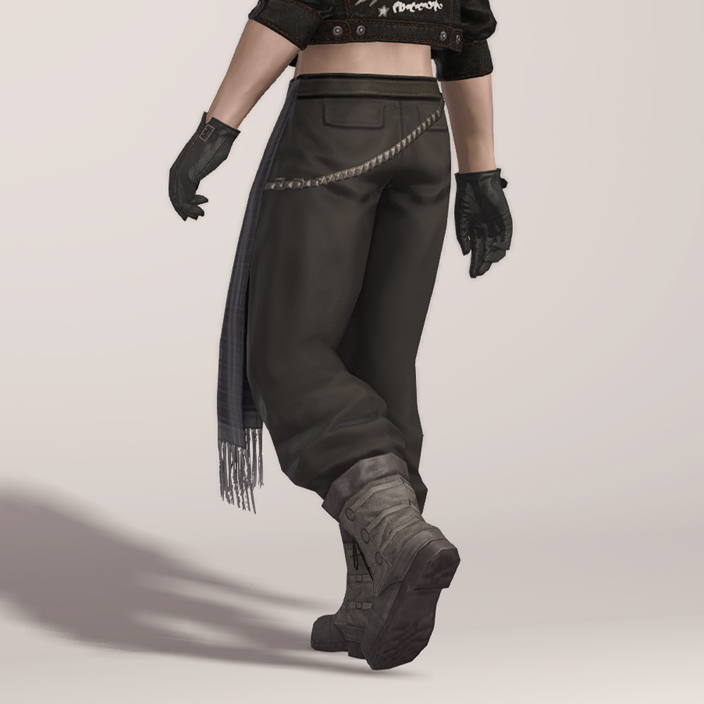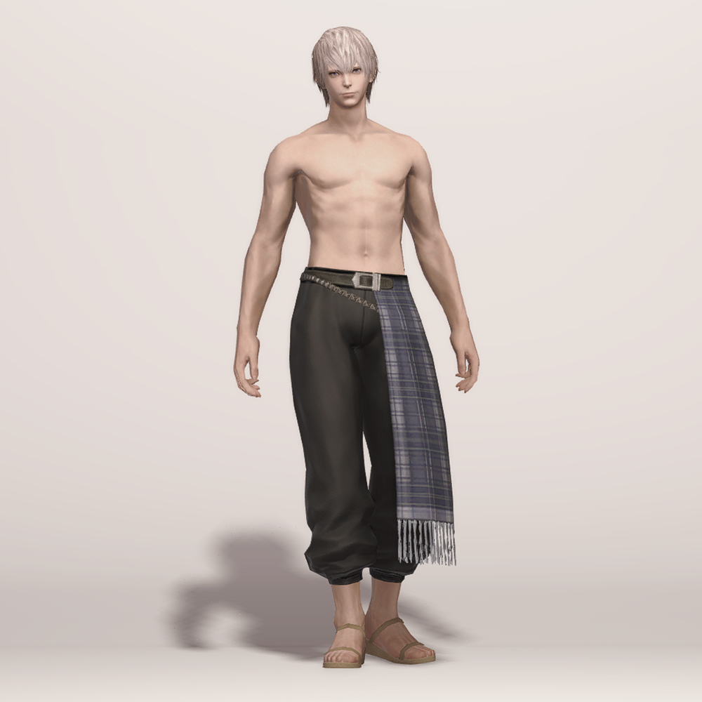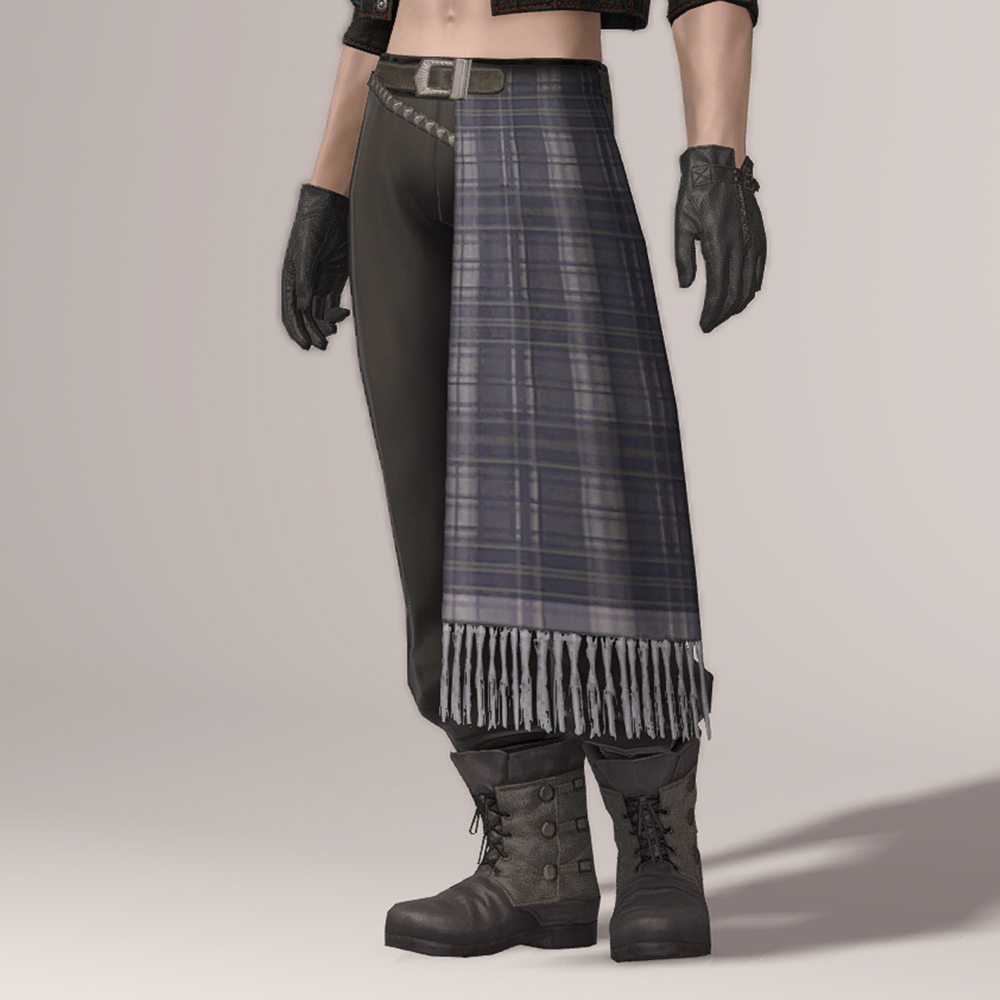 FF13에 언급되는 조직 '노라' 소속 스노우 빌리어스의 의상입니다. 빈티지한 타탄체크 천을 두르고 있는 전체적으로 통이 큰 편한 느낌의 바지입니다. 발목 위까지 오는 길이로, 발목을 드러내는 긴 바지를 찾는다면 고려해봄직 합니다. 바지 상단에 금속 사슬을 달아 스타일리쉬한 느낌을 더했습니다.