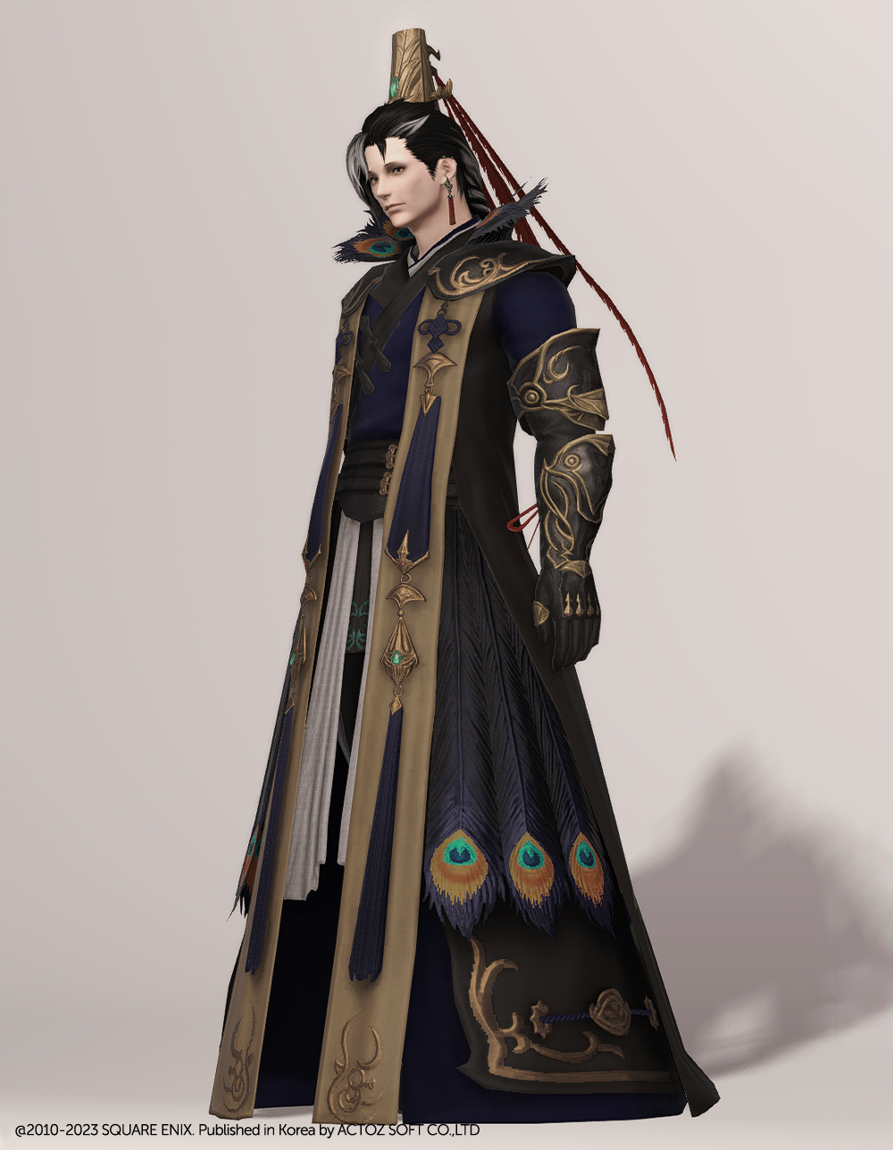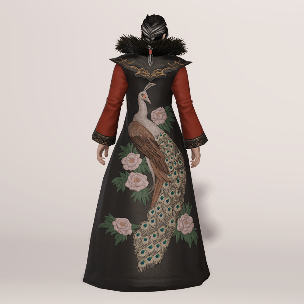위엄있는 공작 꼬리깃 목장식이 눈에 띄는, 공작을 모티브로 한 의상입니다. 어깨 장식이 풍채가 좋아보이게 함은 물론이고, 늘어트린 노리개 술장식, 곳곳에 화려하게 들어간 금자수가 착용자의 어떠한 격을 드높히는 듯 합니다. 등 뒤 옷자락에 큼지막하게 들어간 공작 자수도 인상깊습니다. 이름 그대로, 공작과 같은 화려함을 그대로 담았습니다.