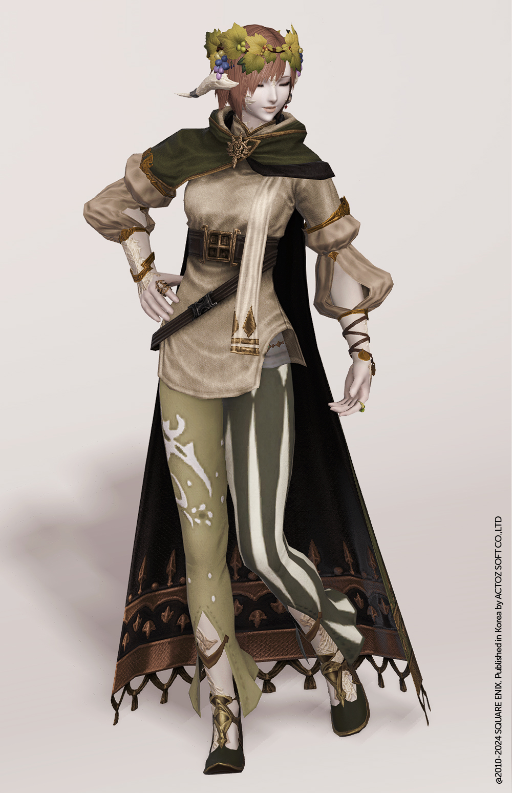니어 오토마타의 레지스탕스 캠프 리더인 아네모네의 오마쥬 의상입니다. 살짝 두께감 있는 넉넉한 옷 위로 두꺼운 벨트 등을 매치하고 어깨 위로 고풍스러운 장식이 있는 망토를 둘러 우아한 분위기를 자아냅니다. 요르하 부대 문양의 브로치와 색을 맞춘 기하학적 무늬가 망토 밑자락에 들어가 있습니다. 어떤 하의를 매치하더라도 무난하게 조합될 법한 디자인으로, 미니원피스처럼 매치하는 것도 좋습니다.. 판타지 느낌이 가미된, 얌전하면서도 수수하지 않은 상의를 찾으신다면 눈여겨 볼 만 합니다.