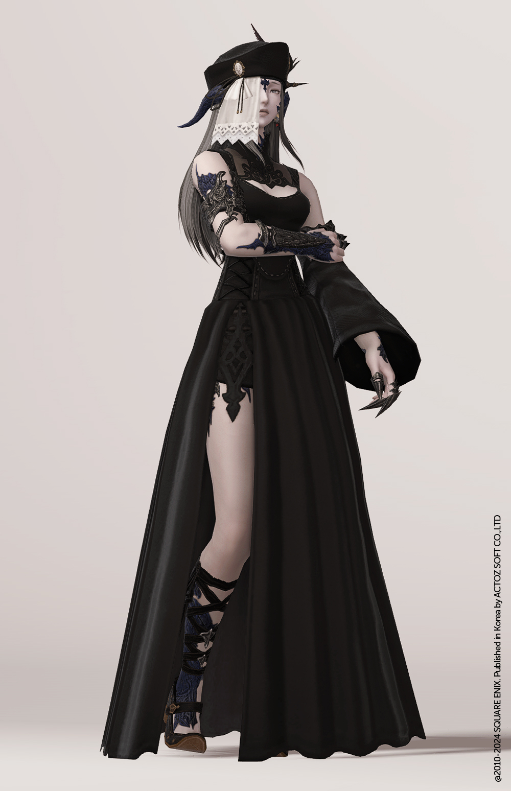 상체에 딱 붙는 의상 밑으로, 과감한 트임이 포인트인 머메이드라인 드레스입니다. 겨드랑이 기준 위쪽으로 사용된 시스루 재질과 치마 트임 사이에 자리잡은 문양장식이 시선을 사로잡습니다. 팔을 완전히 드러내는 민소매형 의상으로, 다양한 형태의 장갑을 매치할 수 있는 점이 포인트. 어떤 고풍스러운 디테일의 모자든 우아하게 어울립니다.