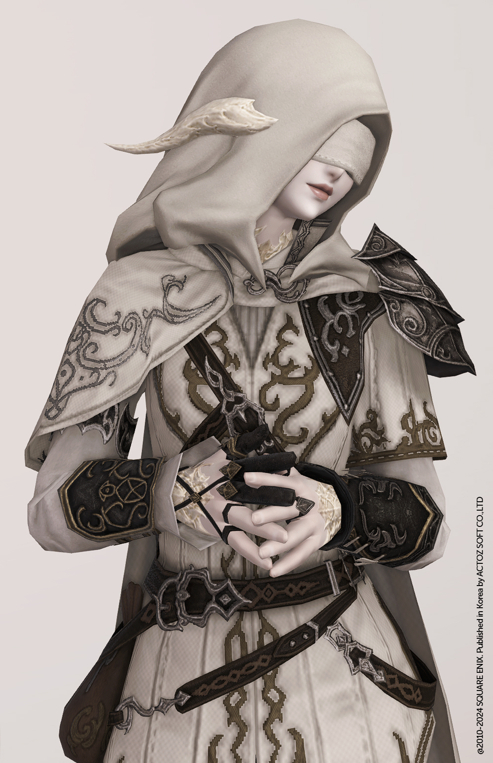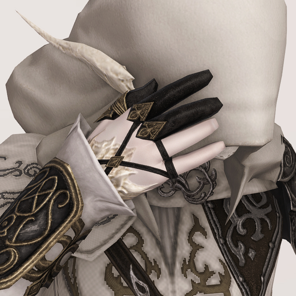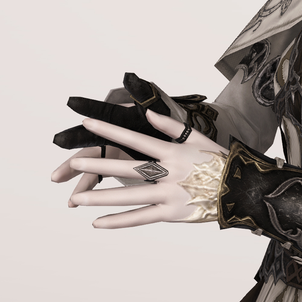얇은 가죽라인과 멋스러운 금속장식이 인상적인 세련되고 섬세한 감성의 세손장갑입니다. 활 시울을 당기는 오른손의 세 손가락만을 감싸고 나머지는 얇은 가죽벨트로 처리한 궁수용 장갑입니다. 장갑보다 손 보호구에 가까운 모습입니다만 멋들어지기만 하면 그만입니다. 황색 계열의 마름모형 금속 장식들을 교차점마다 사용해 마감하였고, 왼손은 대신 가죽반지와 금속반지를 사용해 통일감을 살렸습니다. 여러모로 화려한 장갑이기에 그에 걸맞은 장비들과 매치하면 손 끝의 디테일마저 섬세하게 챙기는 패셔니스타로 거듭날 수 있을 지도 모릅니다.