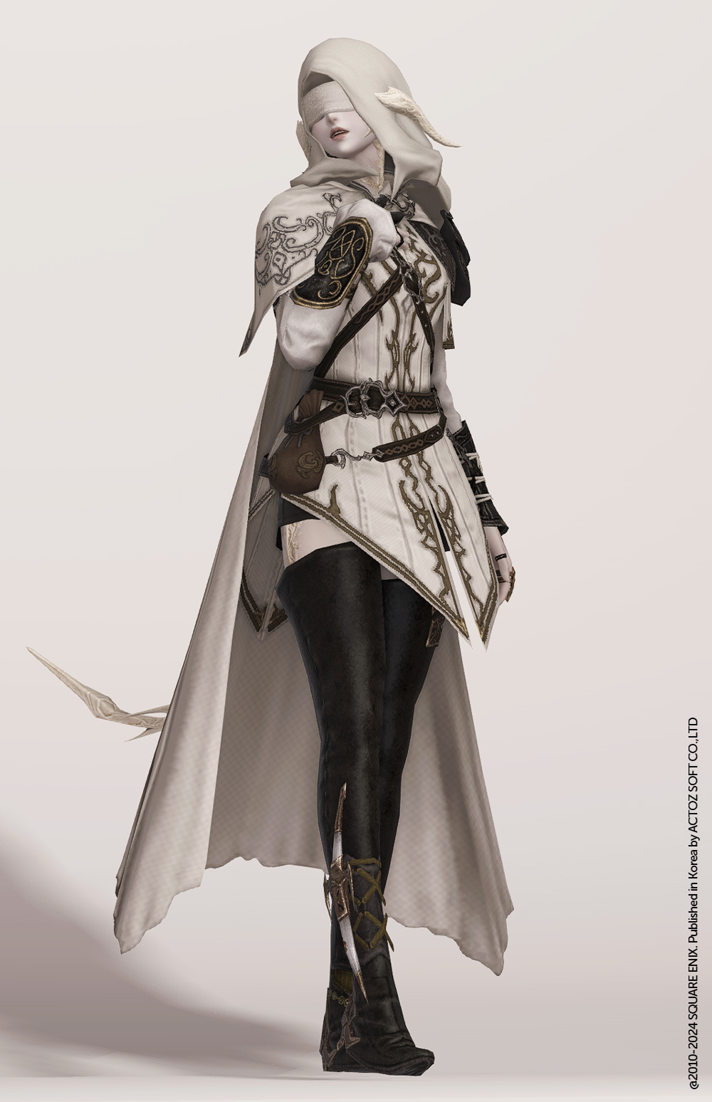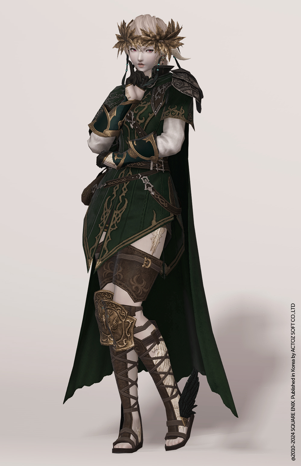 늘 서늘한 숲속의 그림자 밑으로 거니는 감시자여서 그런 것일까요? 두께가 있는 천을 사용하여 그 위로 화려한 식물형 무늬를 수놓은 상의입니다. 허리춤에 맨 벨트에는 주머니를 같이 다는 등, 여러모로 실용성을 챙기기 위한 노력이 보이는 디테일을 빈틈없이 담아 어찌 보면 하네스와 같은 느낌을 주기도 합니다. 어깨를 덮는 망토를 뒤로 길게 늘어트려 보온성을 한 번 더 챙김과 동시에 왼쪽 어깨의 금속판과 팔의 건틀릿형 방어구가 의상 착용자의 본분을 잊지 않게 해 줍니다. 망토 특유의 솔리드함을 사랑하는 동시에 의상의 디테일은 챙겨야 하는, 야망넘치는 분들께 한 번 권하고 싶은 의상입니다.