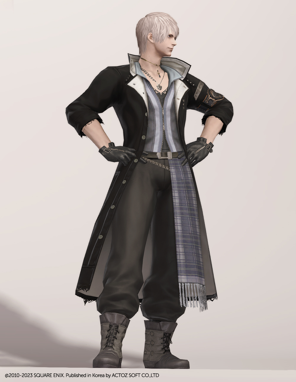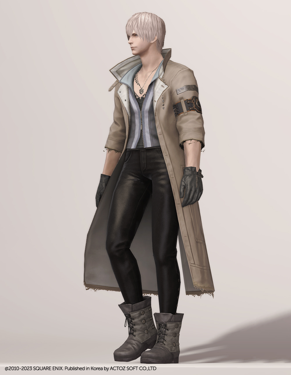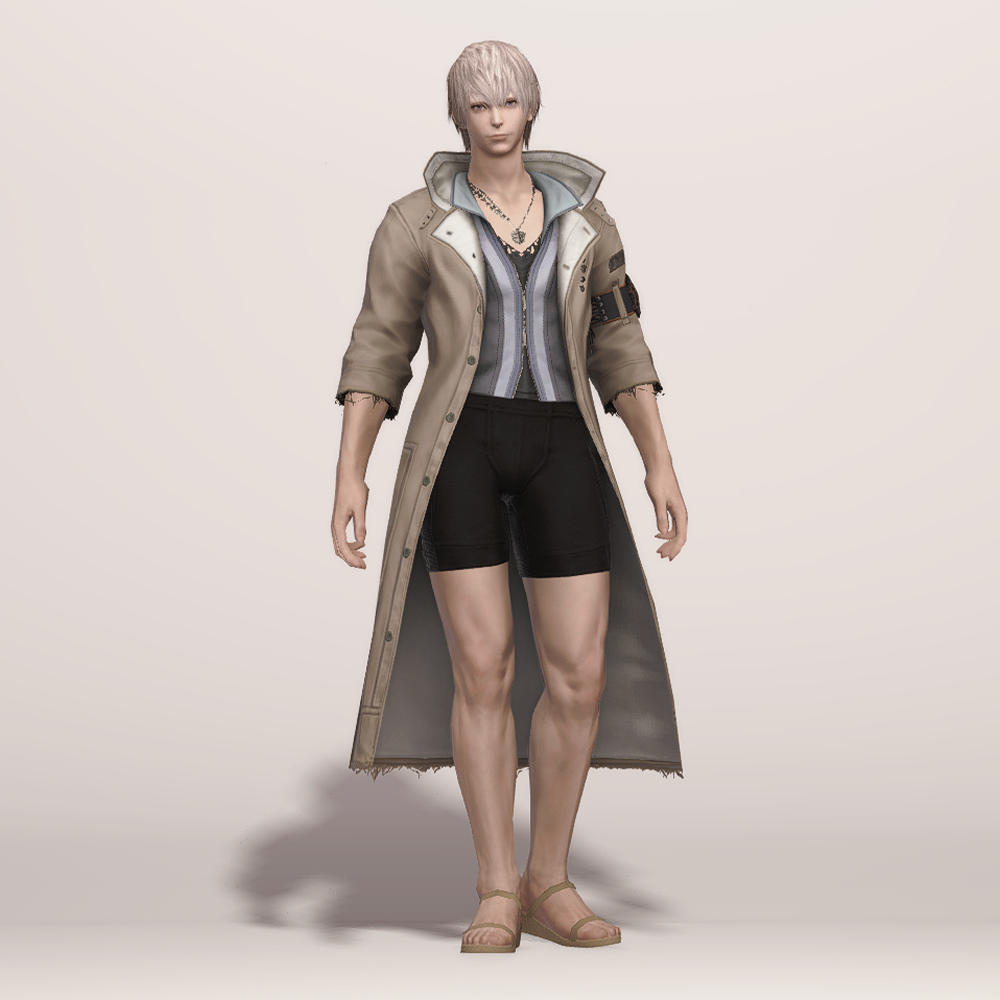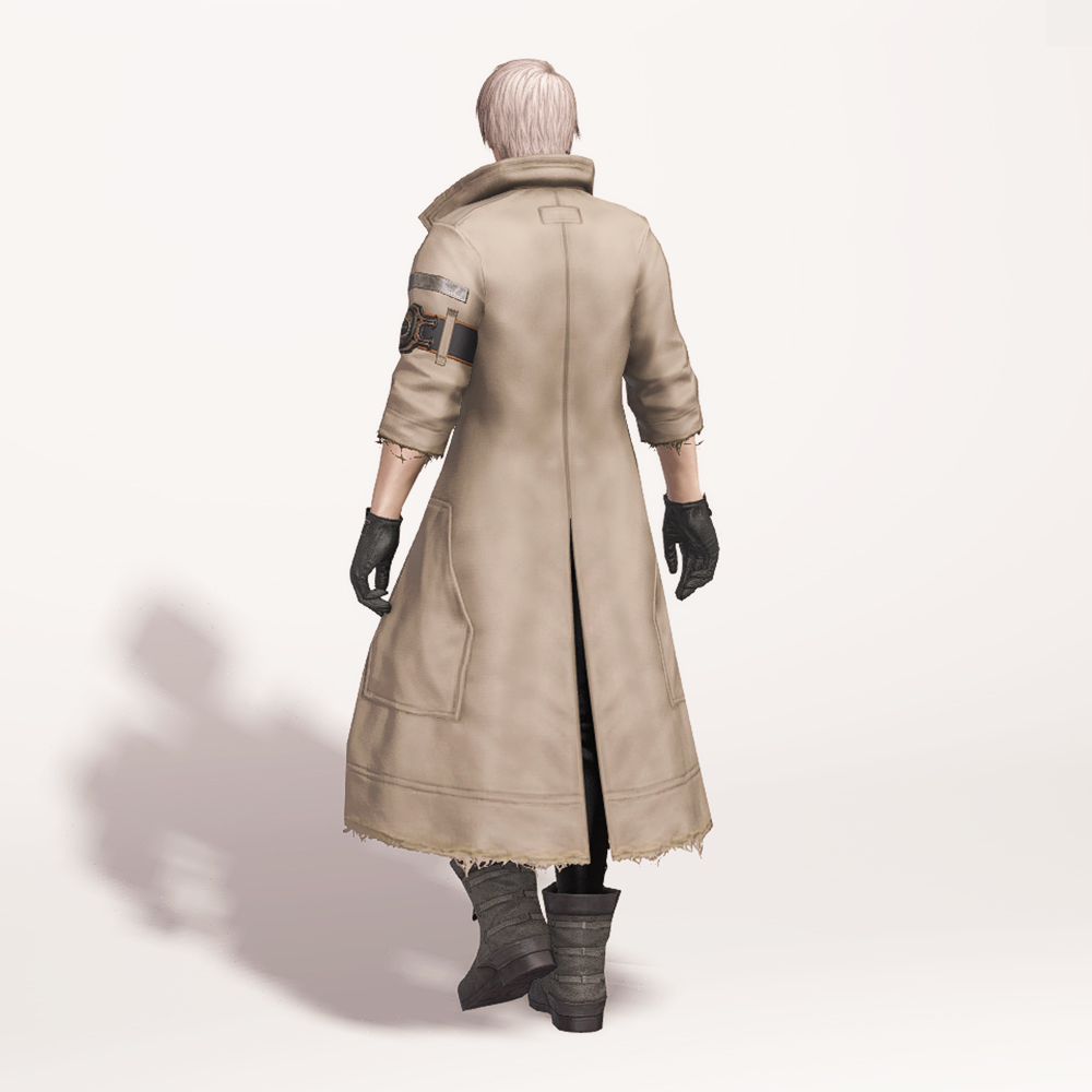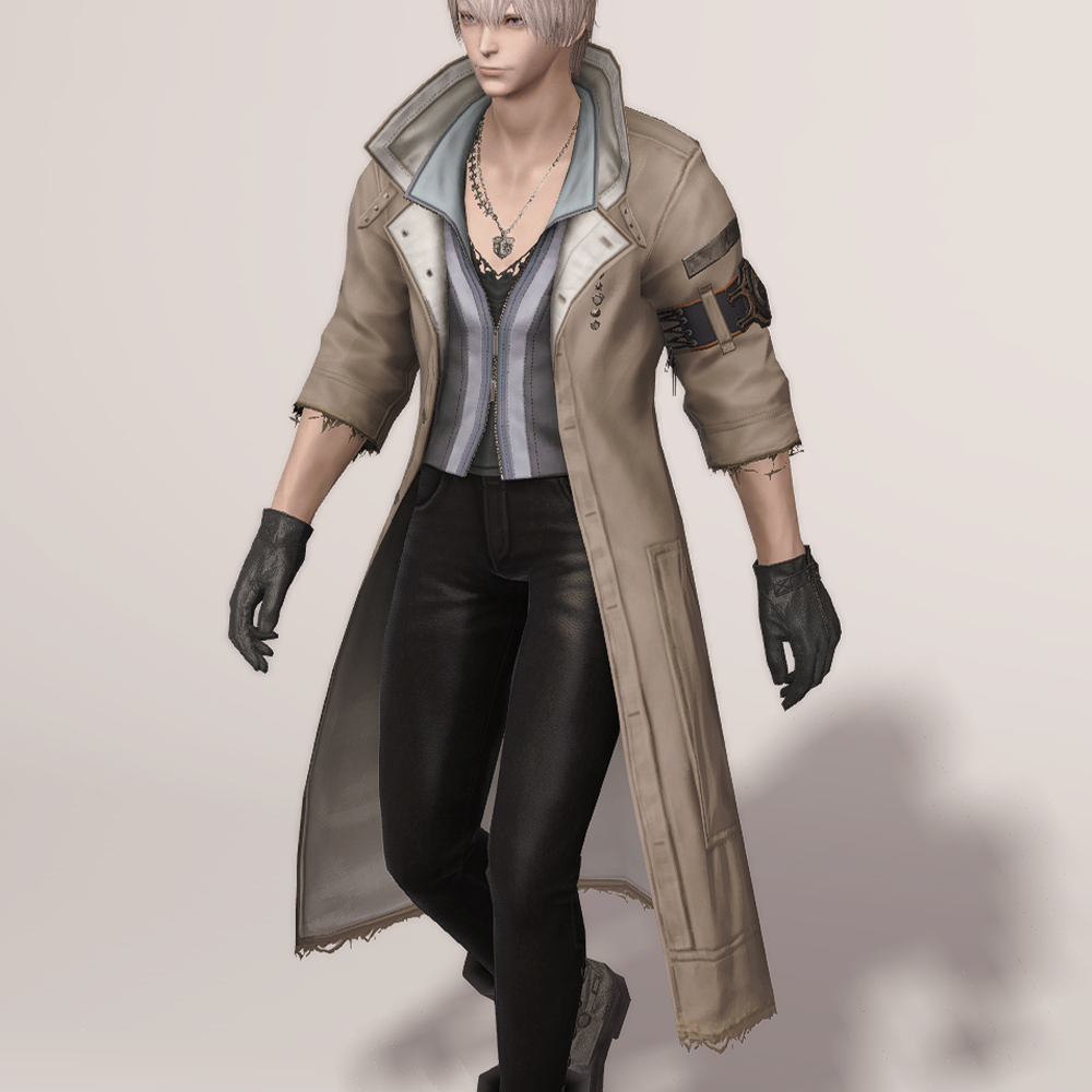 FF13에 언급되는 조직 '노라' 소속 스노우 빌리어스의 의상입니다. 염색이 가능한 코트형 의상으로 FF14에 들어온 이래 오랫동안 사랑받았습니다. 깔끔하게 떨어지는 코트 라인에 더해, 끝의 해진 부분이나 재봉 자국 등 세부적인 디테일이 눈에 띄며, 목 쪽에 자체 목걸이가 매치되어 있어 휑하지 않고, 팔뚝의 벨트 장식 등을 통해 전체적으로 심심하지 않은 디자인입니다. 안에 받쳐 입은 옷 역시 허리선에서 깔끔하게 떨어져 같이 매치할 하의를 강조하고 싶을 때도 좋습니다.